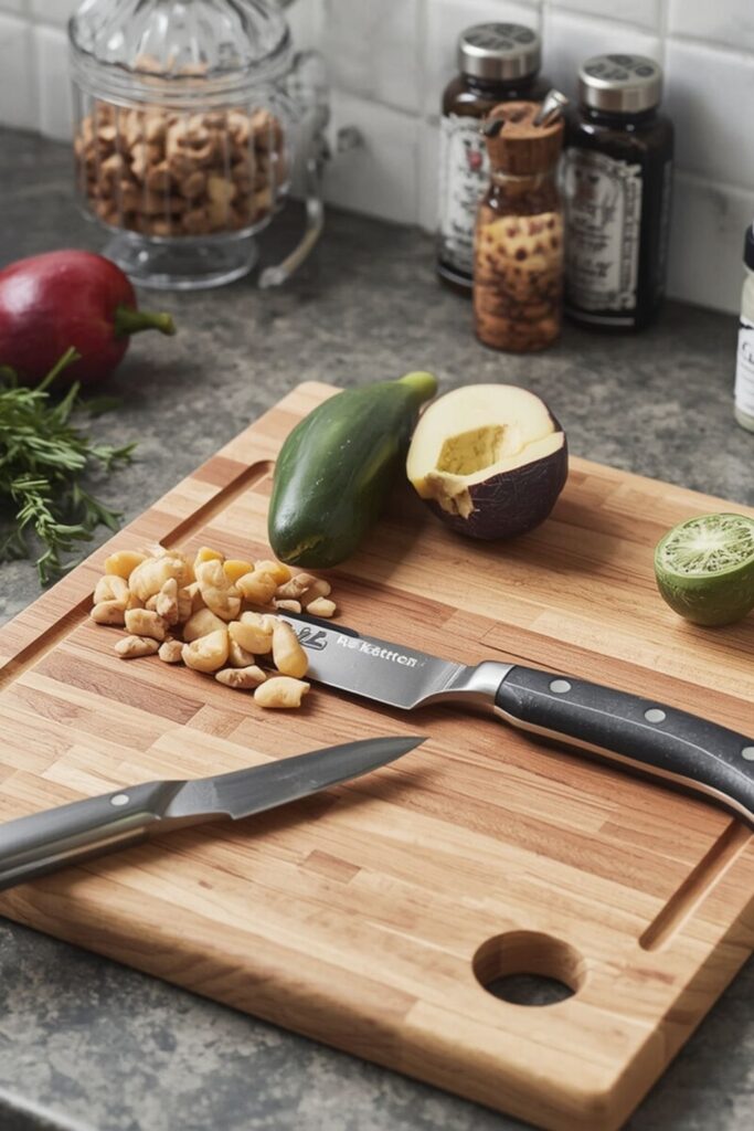 Wooden and high-quality plastic boards are commonly used in modern kitchens. Using separate boards for vegetables and raw meat improves hygiene. A proper cutting board helps maintain cleanliness and supports a calm, controlled cooking environment.