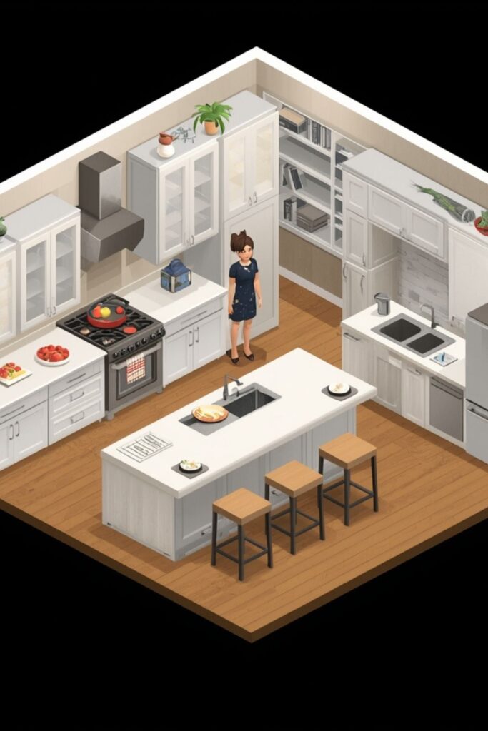 To achieve this look, use clean cabinet designs, neutral colors like white, grey, or beige, and keep wall clutter minimal. Adding an island in the center helps define the kitchen area without closing it off. Open kitchens also look great in roleplay scenarios, as they allow easy movement and interaction between spaces.