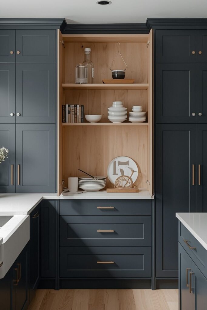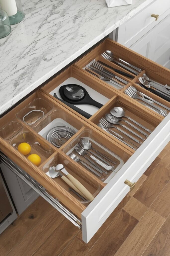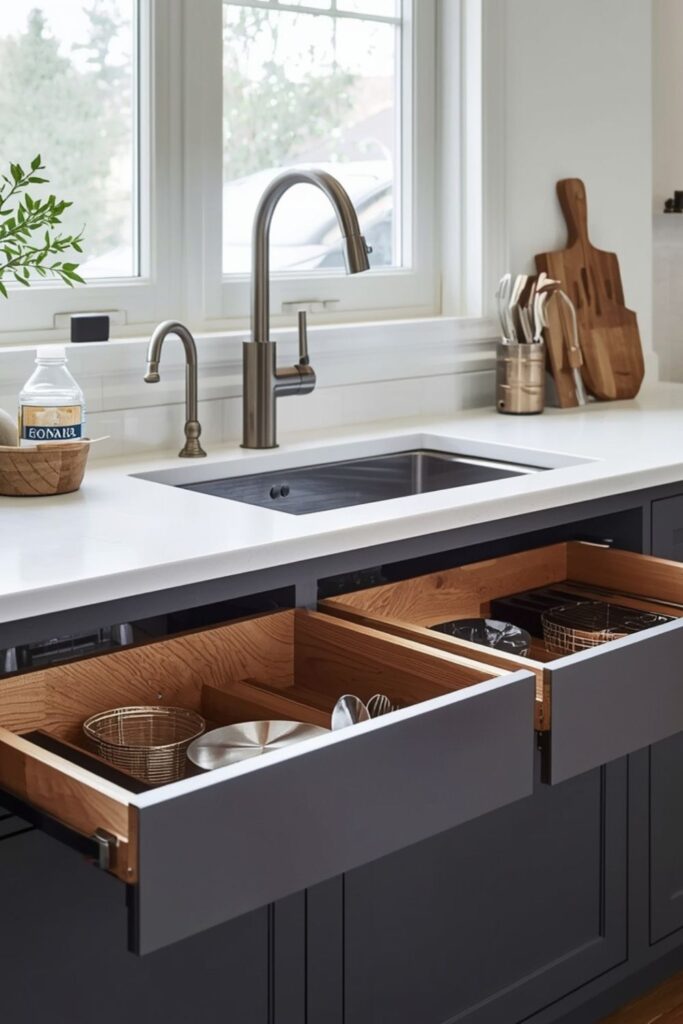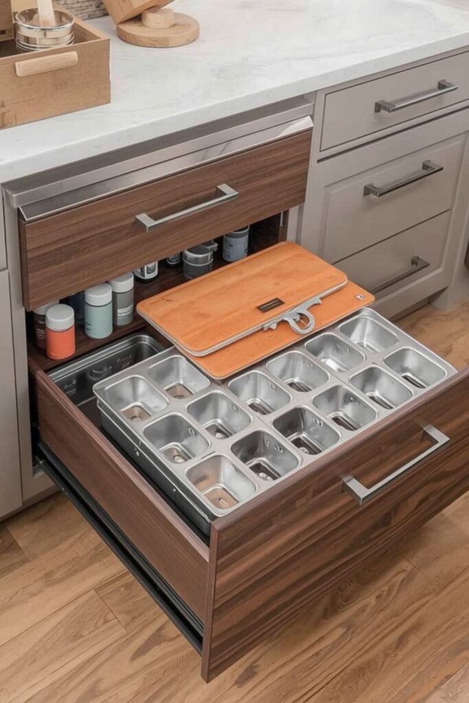 Adding drawers within cabinets creates layered hidden storage without changing the exterior design. These inner drawers organize smaller items and prevent cabinets from becoming cluttered spaces.