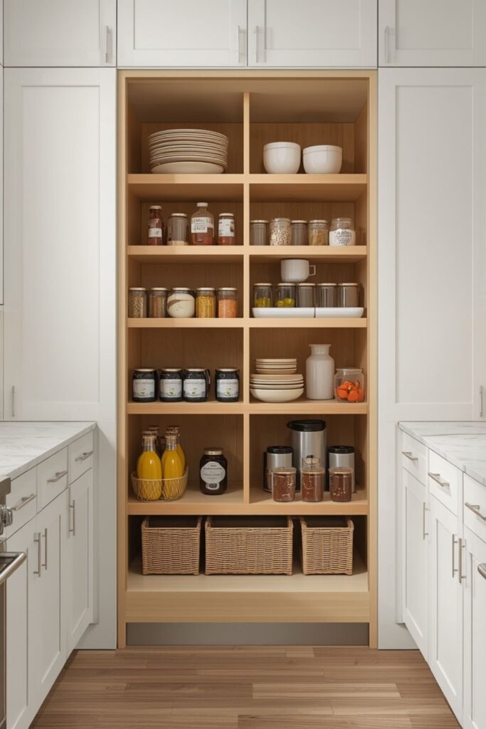 Pull-out pantry systems hide extensive storage behind slim cabinet fronts. When closed, they blend seamlessly with surrounding cabinetry. When opened, they reveal organized shelves that maximize vertical space.
