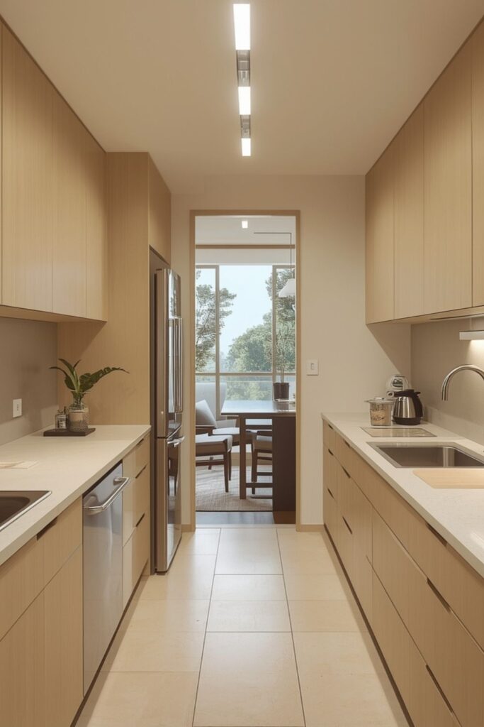 Keeping both sides visually light—using matte finishes and limited upper cabinets—prevents the space from feeling narrow.