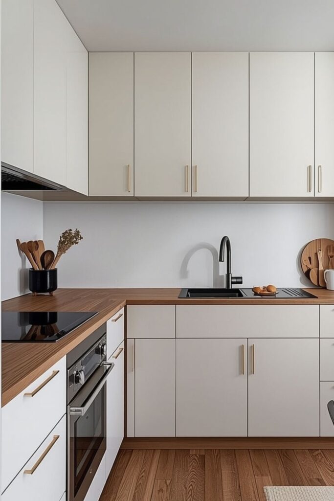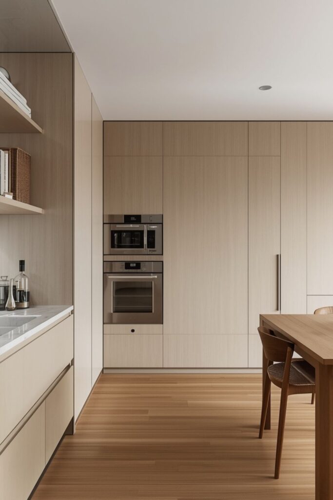 Neutral cabinetry, concealed handles, and natural wood finishes enhance the minimalist feel while maintaining functionality.