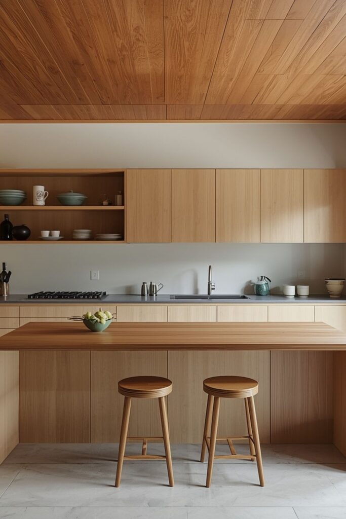 Instead of bulky islands, Japanese-inspired kitchens use low, slim islands. These maintain openness while offering prep or storage space.