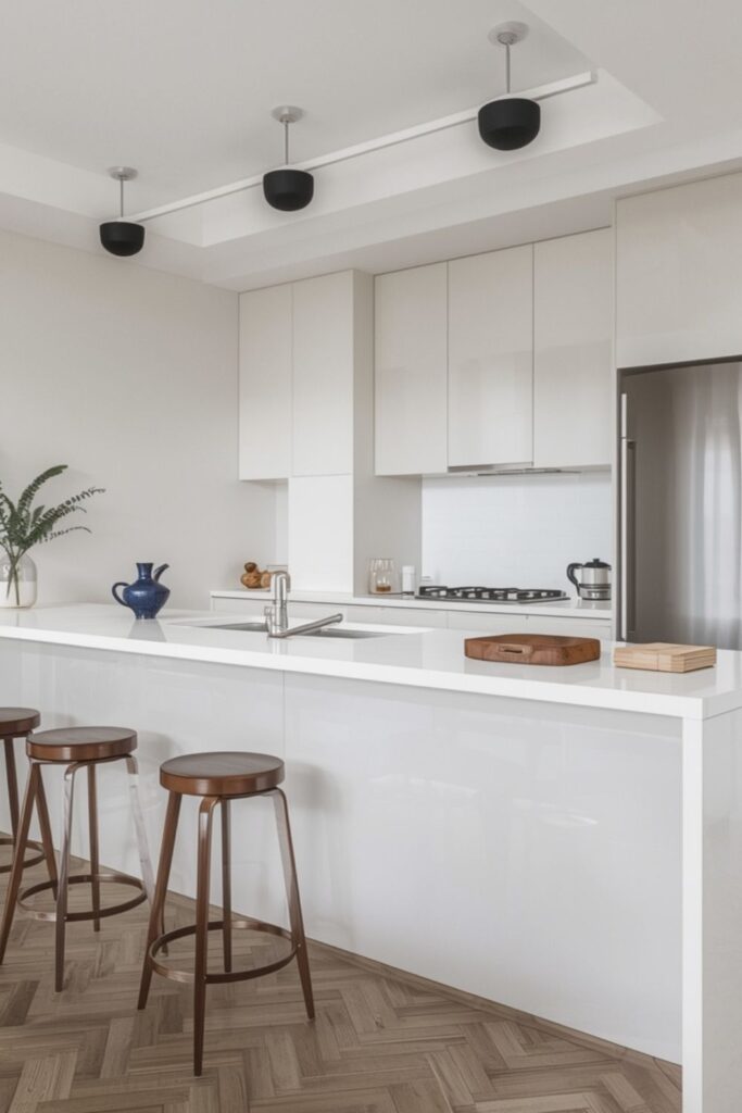 A peninsula provides separation without enclosure. This layout suits modern Japandi kitchens in apartments.