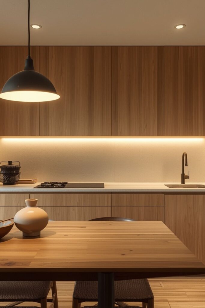 Lighting in minimal Japanese kitchen layout solutions is always warm and comforting. Pendant lights, under-cabinet lighting, or low-profile ceiling fixtures produce a soft glow that supports a relaxed cooking experience. Natural daylight is encouraged whenever possible.