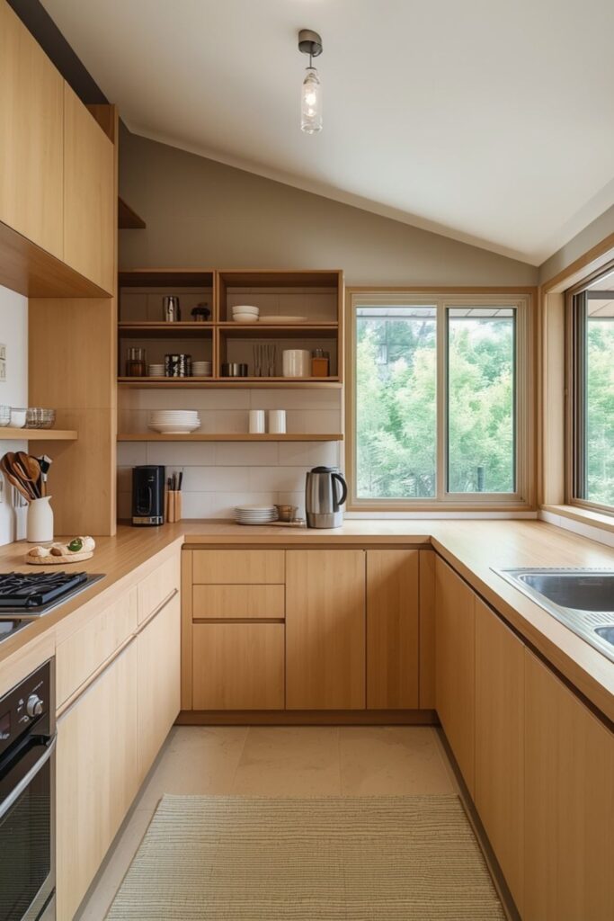 In slightly wider small homes, an L-shaped layout offers gentle zoning without visual heaviness. These Japanese Kitchen Layouts for Small Homes setups allow cooking and cleaning areas to flow naturally into each other.