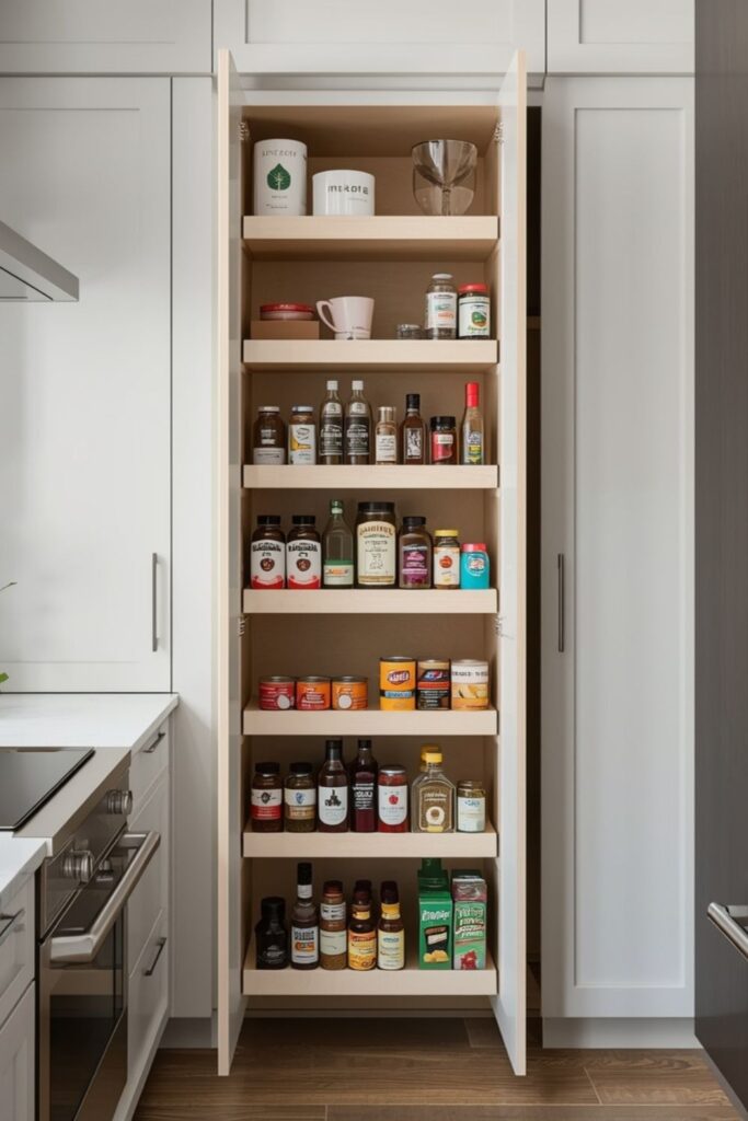Slim pull-out pantry systems maximize height without taking up extra floor space. They are ideal for spices, oils, and packaged foods.