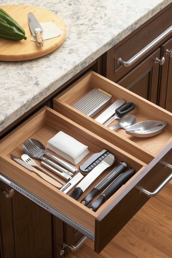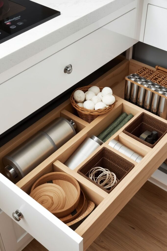 Inner drawer organizers, pull-out racks, and concealed compartments help categorize items without visual overload.