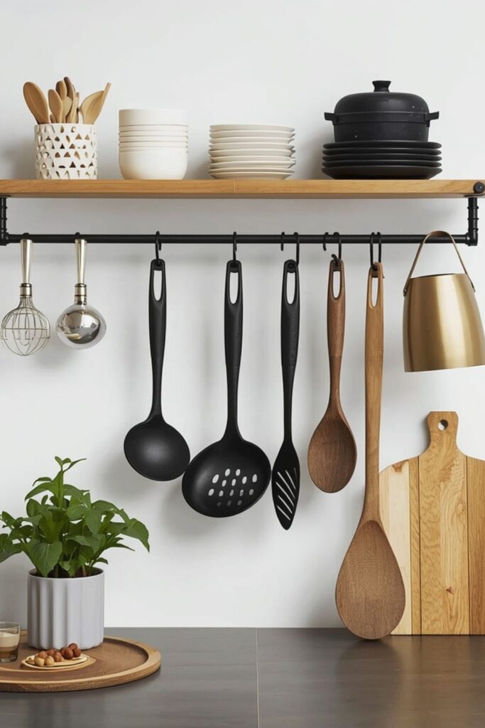 Metal or wooden rail systems allow utensils, ladles, and mugs to hang neatly on walls. This keeps counters clear and improves workflow.