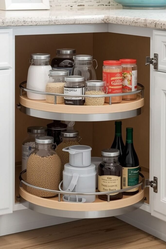 Lazy Susans or pull-out corner systems prevent wasted space. These systems keep rarely used items organized and accessible.