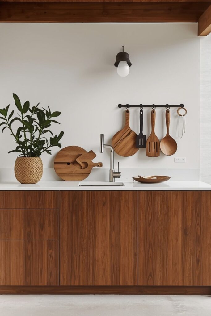 Minimal outdoor kitchens rely on function rather than decoration. Instead of decorative tiles or accessories, a single plant, a clean countertop, or a simple utensil rail becomes the visual focus.