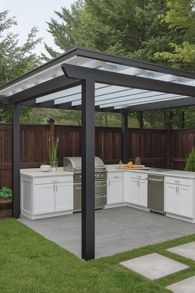 A small roof or pergola gently defines the outdoor kitchen without enclosing it completely. This is especially helpful in small outdoor kitchens where protection from sun or rain is needed, but openness must be preserved.