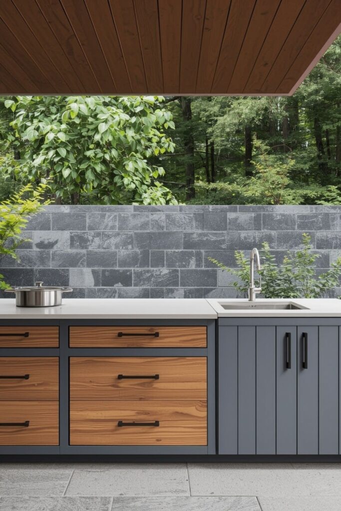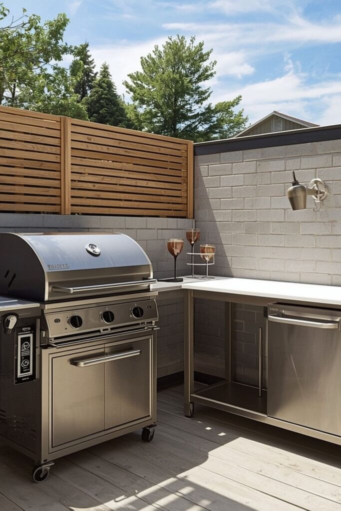 Including a sink does not require a full outdoor kitchen setup. Minimal outdoor kitchen ideas often use a compact counter with an integrated sink to support basic cooking and washing needs. This approach reduces clutter and avoids unnecessary plumbing complexity.