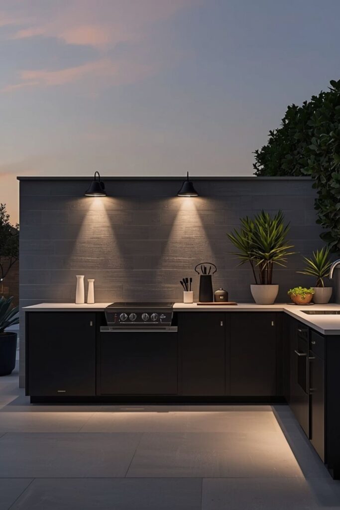 Good lighting makes small outdoor kitchen ideas feel welcoming without overpowering the space. It supports relaxed evening cooking while preserving a calm atmosphere.