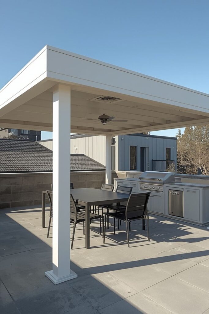 A light roof or pergola creates comfort without enclosing the space fully. It protects cooking areas from weather while allowing air and light to pass through.