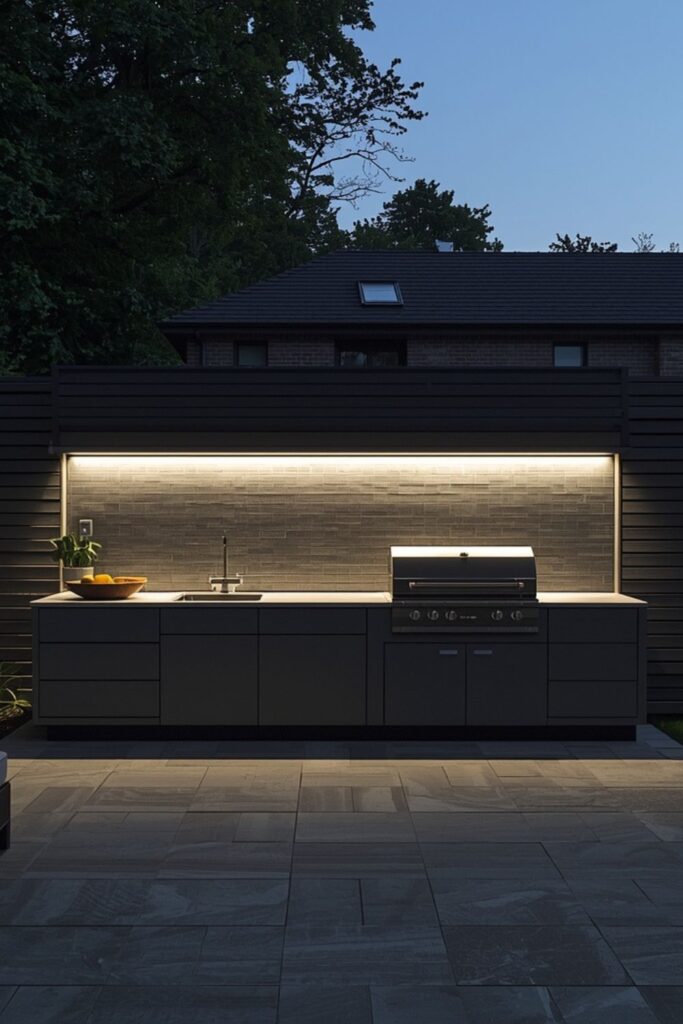 Lighting in minimalist outdoor kitchen concepts is subtle, functional, and never decorative for its own sake.