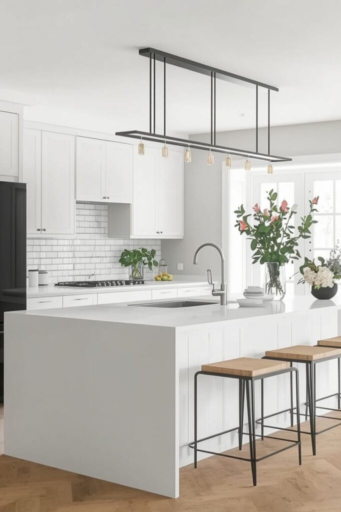 Linear chandeliers are a favourite in modern kitchens because they deliver impact without visual clutter. Their streamlined form works especially well over kitchen islands, providing even illumination across prep and dining areas. Matte black, brushed brass, or soft champagne finishes are popular choices that feel understated yet polished.