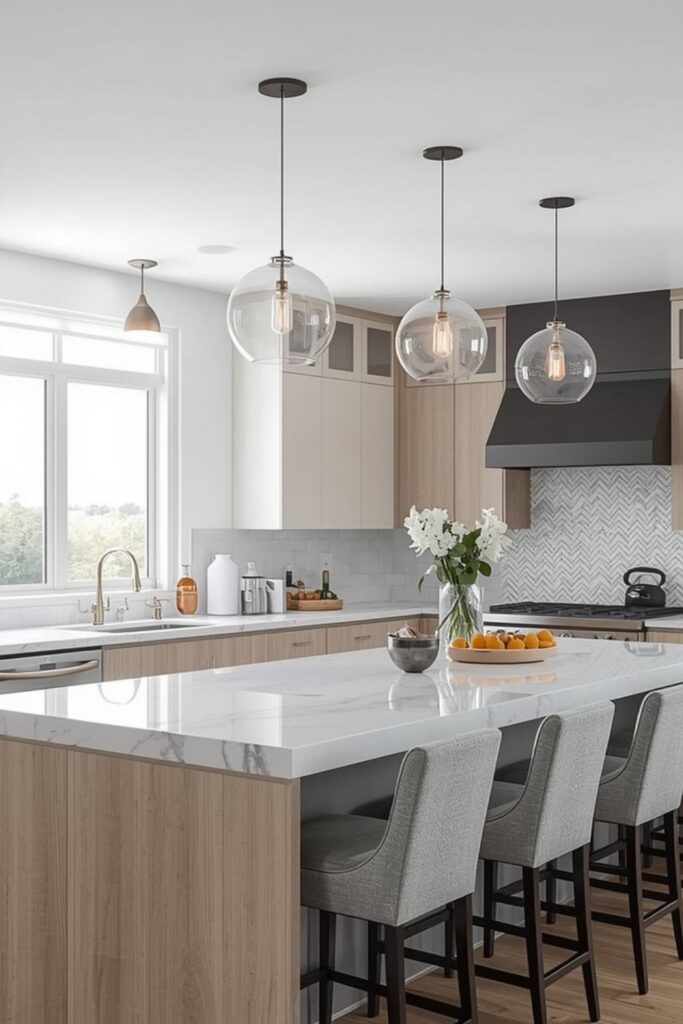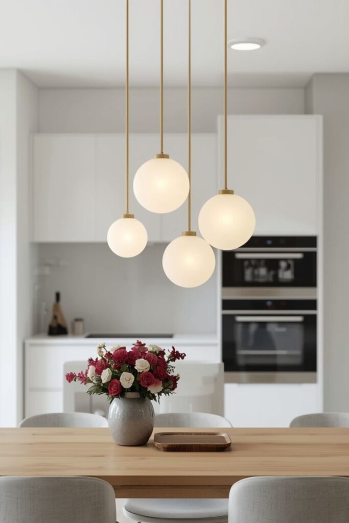 Glass globe chandeliers bring a sense of lightness and elegance to kitchen interiors. Their rounded shapes soften the clean lines typically found in modern kitchens, creating a more welcoming atmosphere. Frosted or opal glass works particularly well, diffusing light gently and reducing glare.