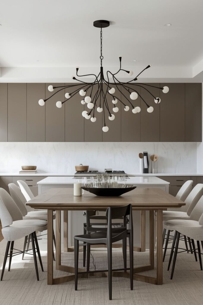 Large kitchens benefit from chandeliers with a bit more presence. Oversized modern chandeliers fill vertical space beautifully while grounding expansive layouts. The trick is to maintain simplicity in design so the fixture feels bold yet elegant.