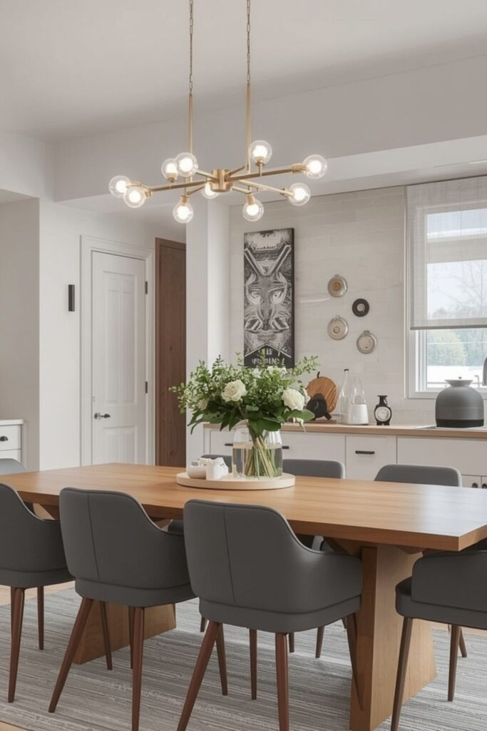 Placing a chandelier over a kitchen dining table creates a natural focal point and enhances the dining experience. Modern designs keep the look clean by avoiding heavy ornamentation and opting for balanced proportions.