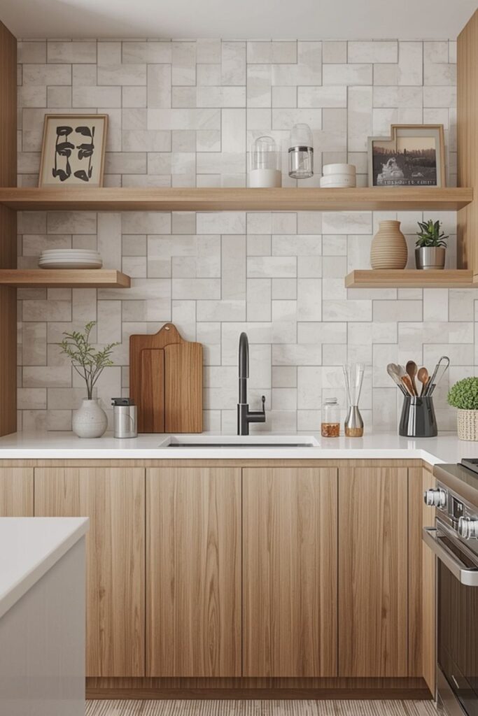 Wood cabinets bring warmth into modern kitchens, and the right backsplash helps balance that warmth. Neutral stone tiles, soft beige ceramics, or light textured surfaces pair well with wood tones. These Modern Kitchen Backsplash Ideas allow natural materials to stand out without visual conflict.