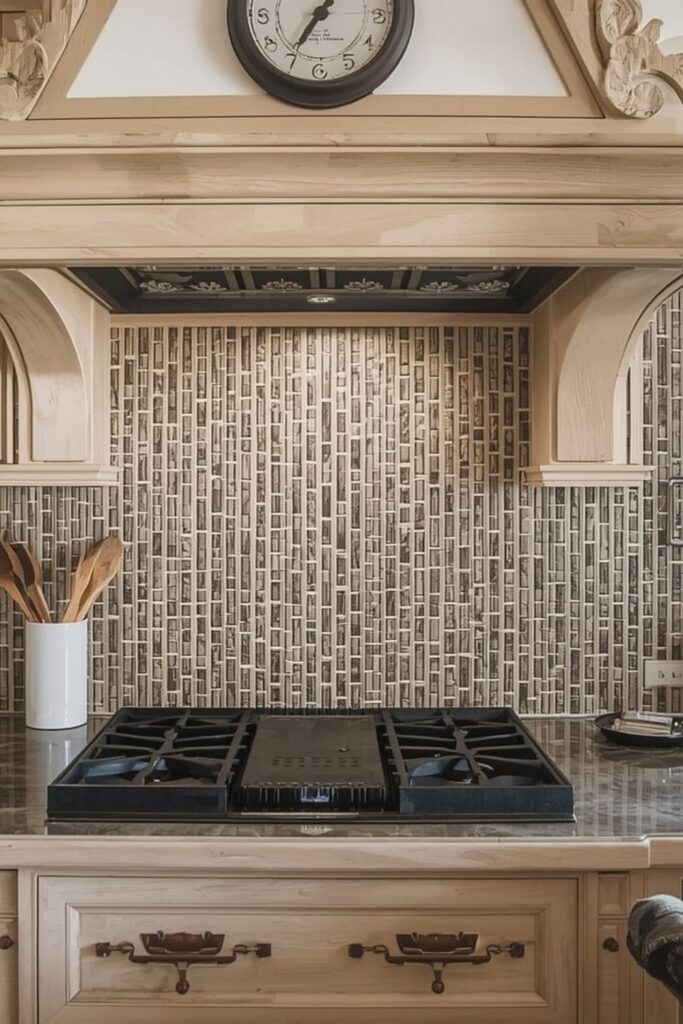 Unique kitchen backsplash ideas do not need bold colors or dramatic patterns. Uniqueness can come from tile shape, layout direction, or material choice. Vertical stacking, narrow tiles, or natural stone pieces create quiet individuality.