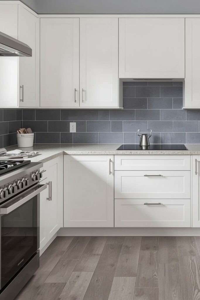 Soft grey backsplash tiles provide contrast without harshness. They create visual separation from white cabinets while preserving a minimalist tone.