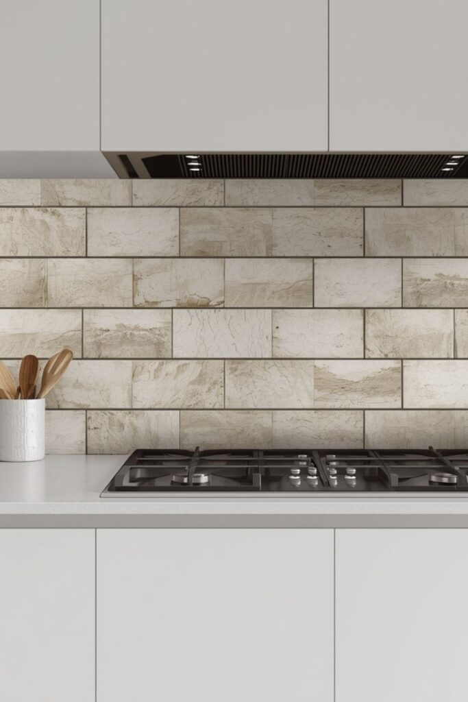Modern kitchen backsplash tiles with stone finishes work well in homes that prioritise warmth alongside minimalism, especially when paired with simple cabinetry.
