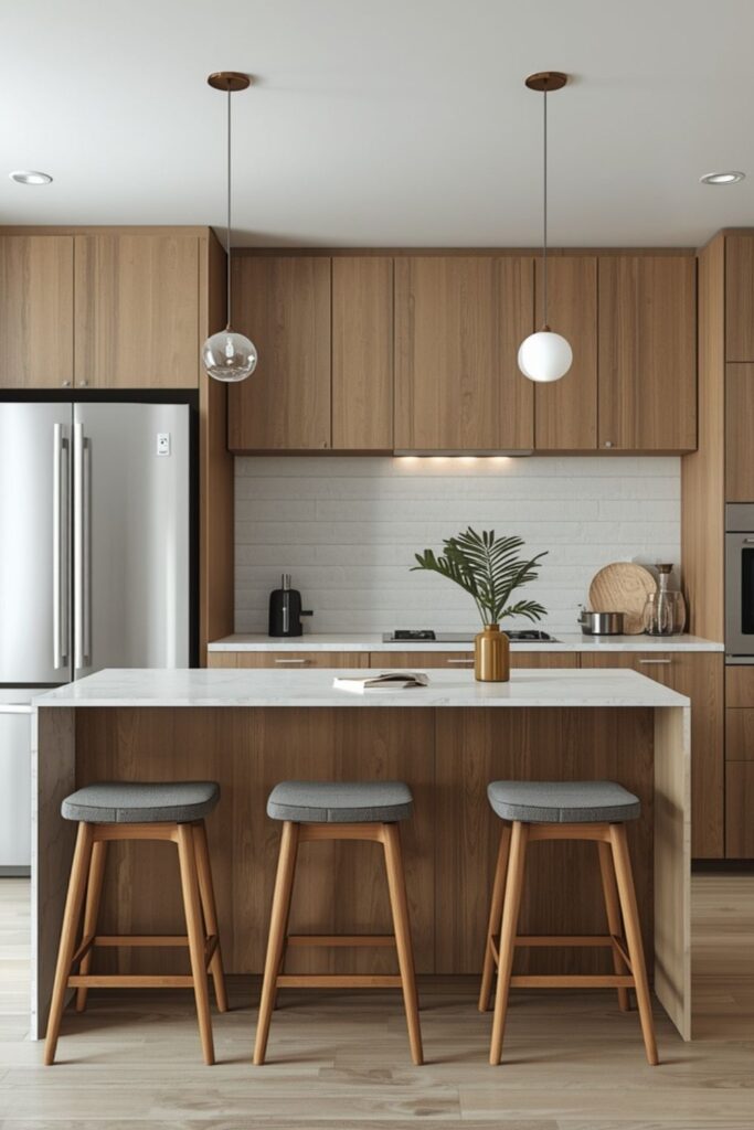 A peninsula offers the benefits of an island without demanding extra space. In modern kitchen design for compact urban homes, it acts as a prep surface, dining counter, or subtle room divider.