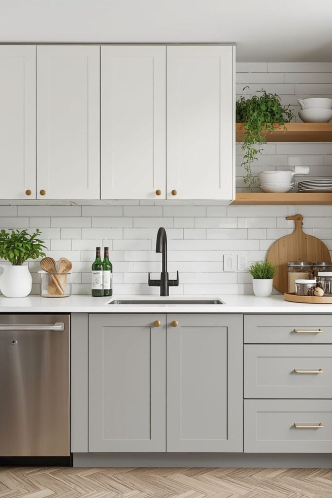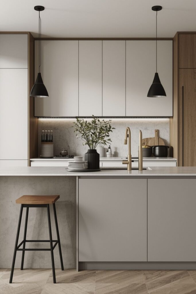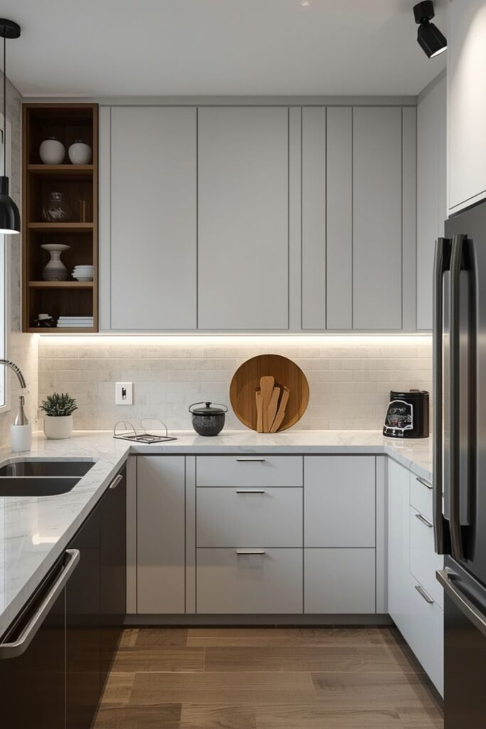Color plays a critical role in compact kitchens. Modern designs rely on neutral palettes—soft greys, warm whites, muted woods—with gentle contrast for depth.