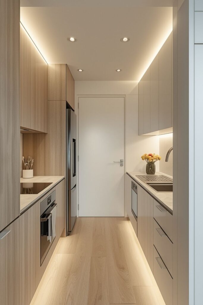Parallel layouts work well in narrow city apartments when cabinet depth is carefully controlled. Modern kitchens use slim base units and lighter finishes to avoid corridor-like tightness.
