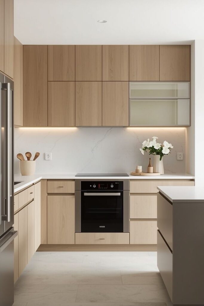 This design reduces visual noise and allows the rest of the home to breathe, especially in apartments where kitchens open into living areas. Handle-less cabinets and integrated appliances support a clean, uninterrupted look that suits urban lifestyles.