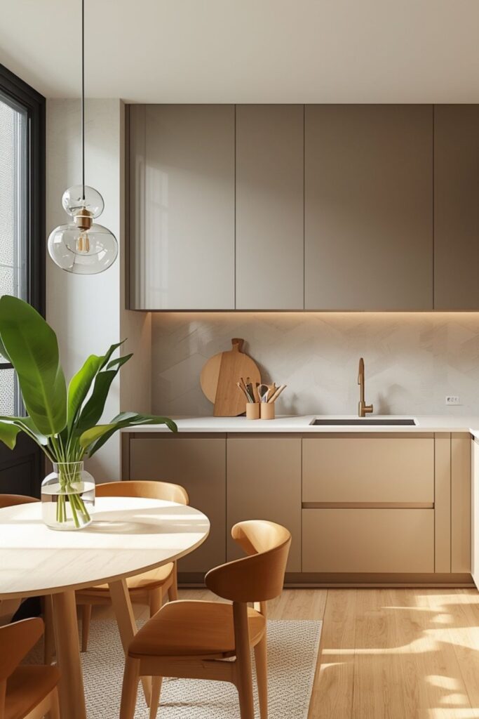 Small kitchens require special attention because every surface matters. Modern kitchen design small spaces feel warmer when simplicity is paired with softness. Light-reflective materials, warm color tones, and uncluttered layouts help compact kitchens feel comfortable rather than constrained.
