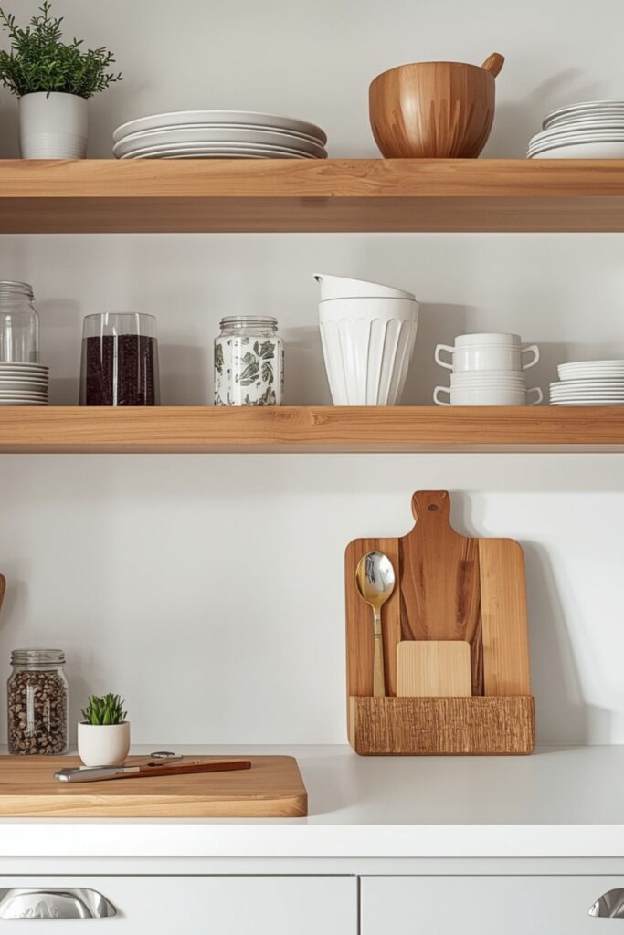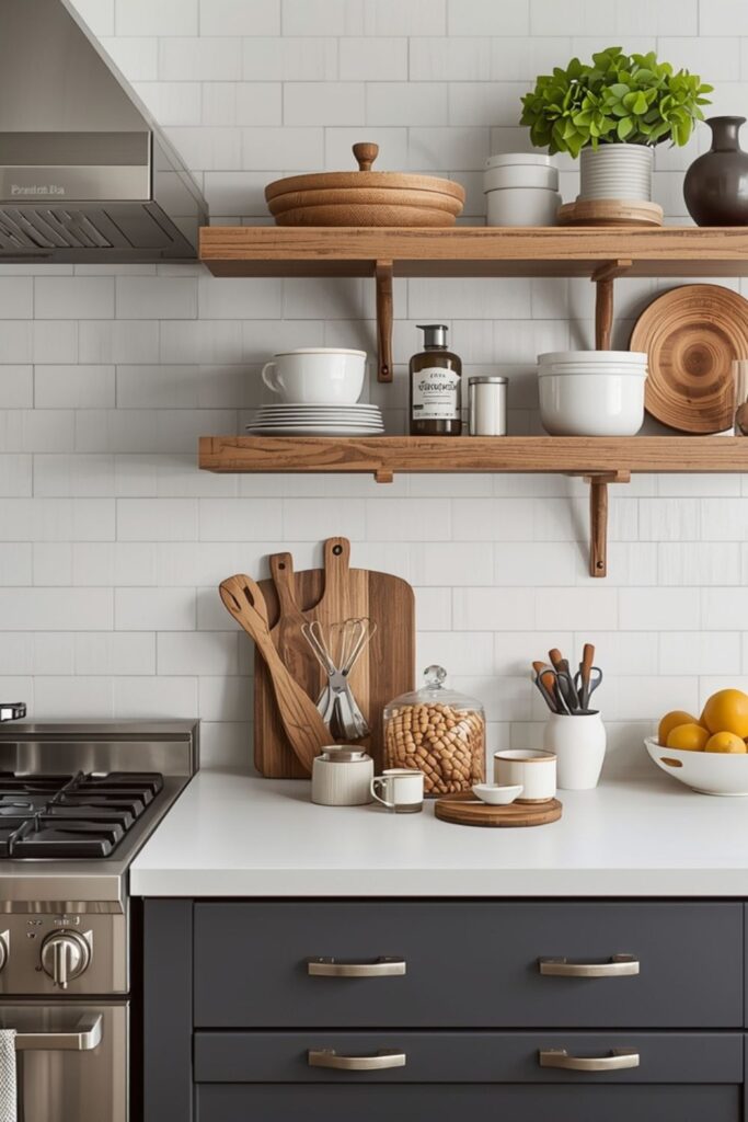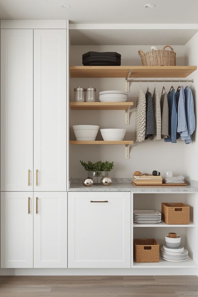 A mix of open shelving and closed cabinets offers flexibility. Everyday items stay within reach, while bulk storage remains concealed.