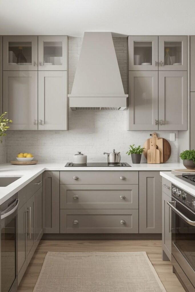 Warm grey is a popular option for homeowners who want modern neutral kitchen ideas without a cold appearance. Unlike cool greys, warm grey has subtle beige or taupe undertones that keep the space feeling comfortable. It works well on cabinets, walls, or even backsplashes.