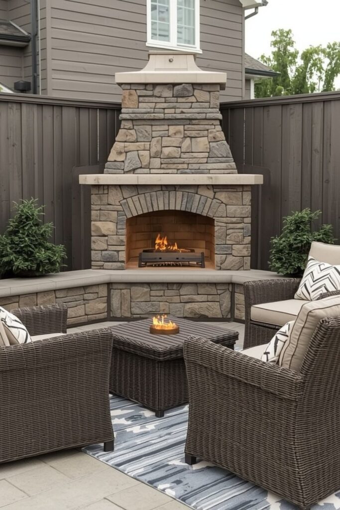 Many Simple outdoor fireplace ideas focus on space-saving placement rather than large structures. A corner setup allows room for seating and movement. It keeps the patio functional without feeling overcrowded.