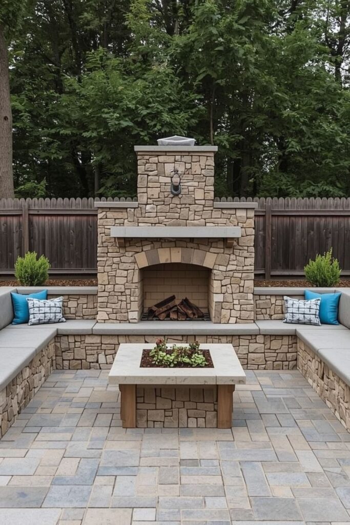 Among the 10 outdoor fireplace patio ideas, built-in seating improves both functionality and appearance. It encourages conversation and makes gatherings more comfortable. Cushions and outdoor fabrics can add extra style and softness.