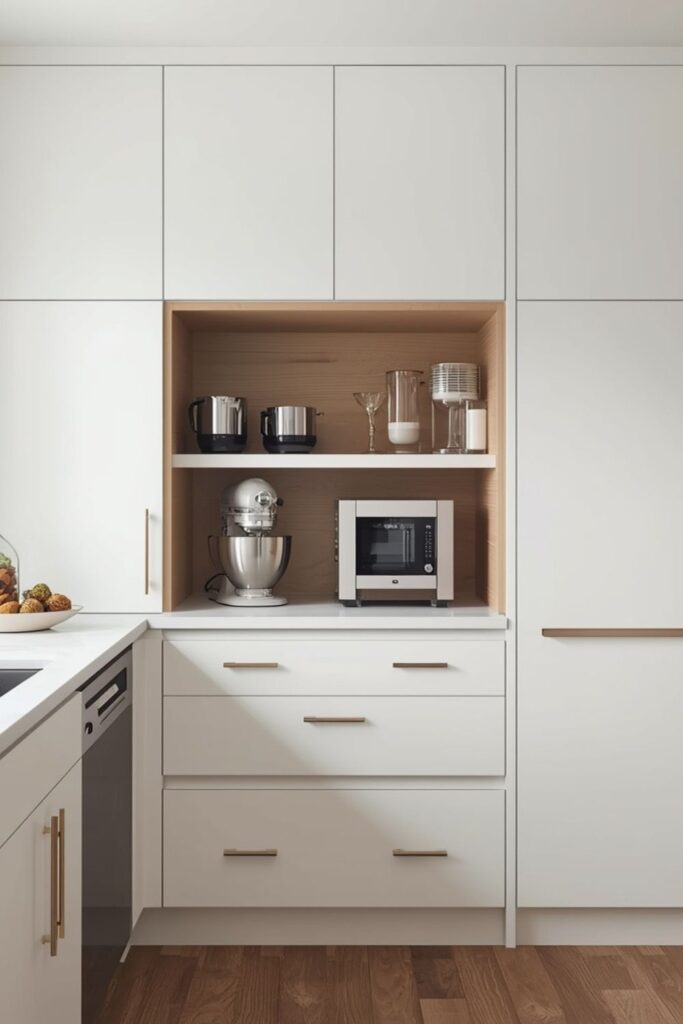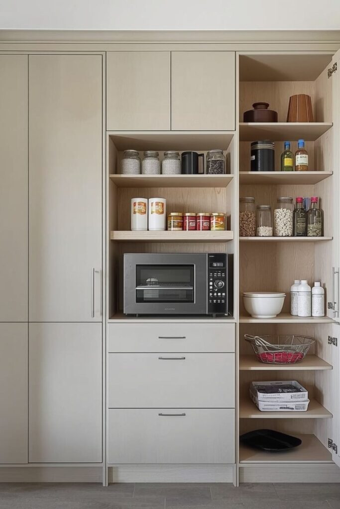 Modern pantry kitchen ideas often include space for small appliances such as microwaves, mixers, or coffee machines. Built-in appliance storage keeps counters clear while maintaining accessibility.