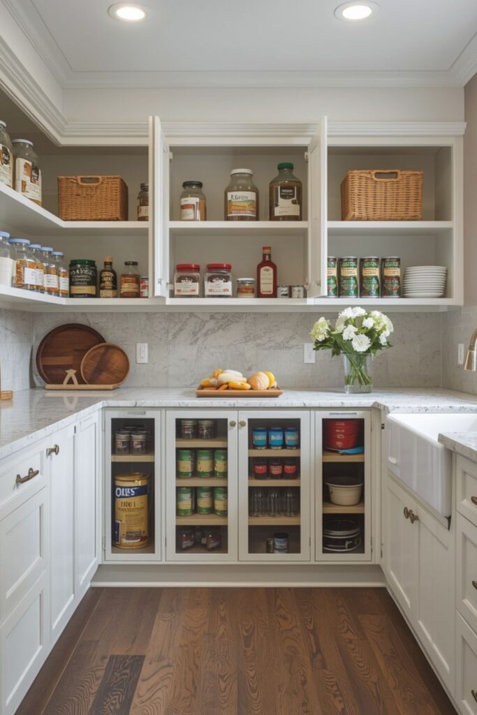 This pantry kitchen design idea works well in kitchens that need visual lightness without full open shelving. Glass-front cabinets add softness and depth while maintaining order.