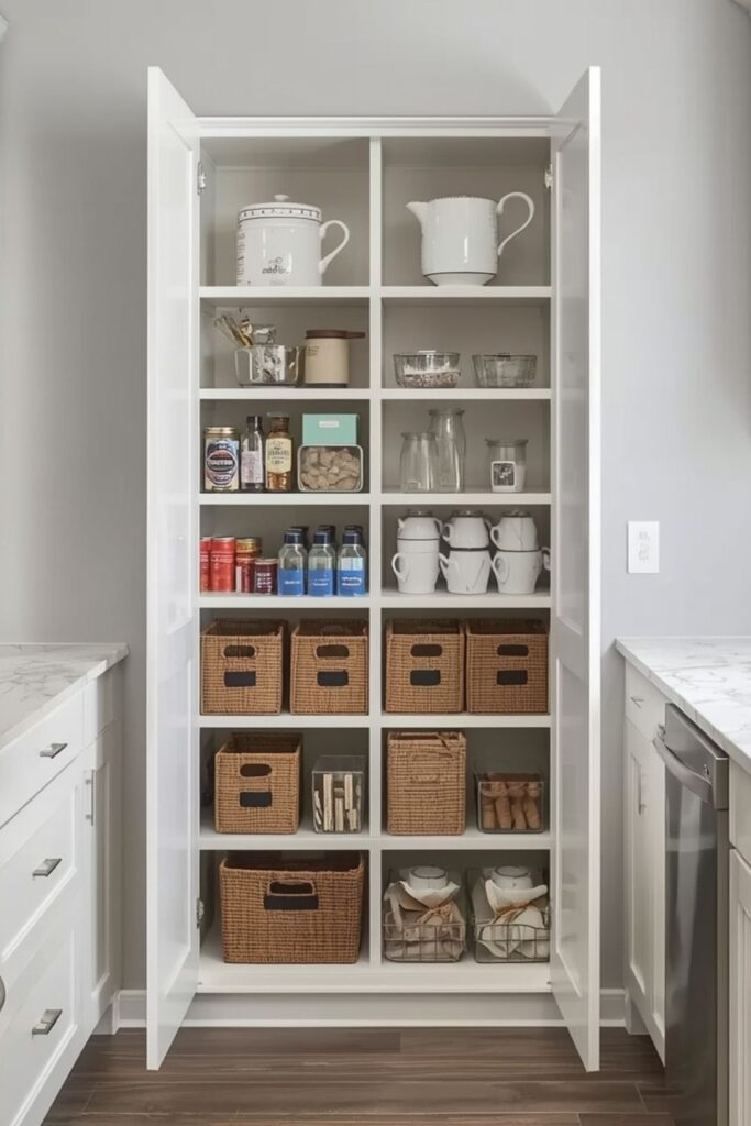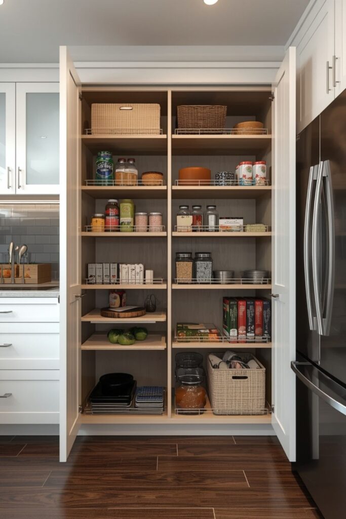 These pantry kitchen ideas are especially useful for narrow kitchens or small spaces where traditional pantry rooms are not possible. Pull-out units fit neatly between cabinets or beside refrigerators without disrupting the kitchen layout.