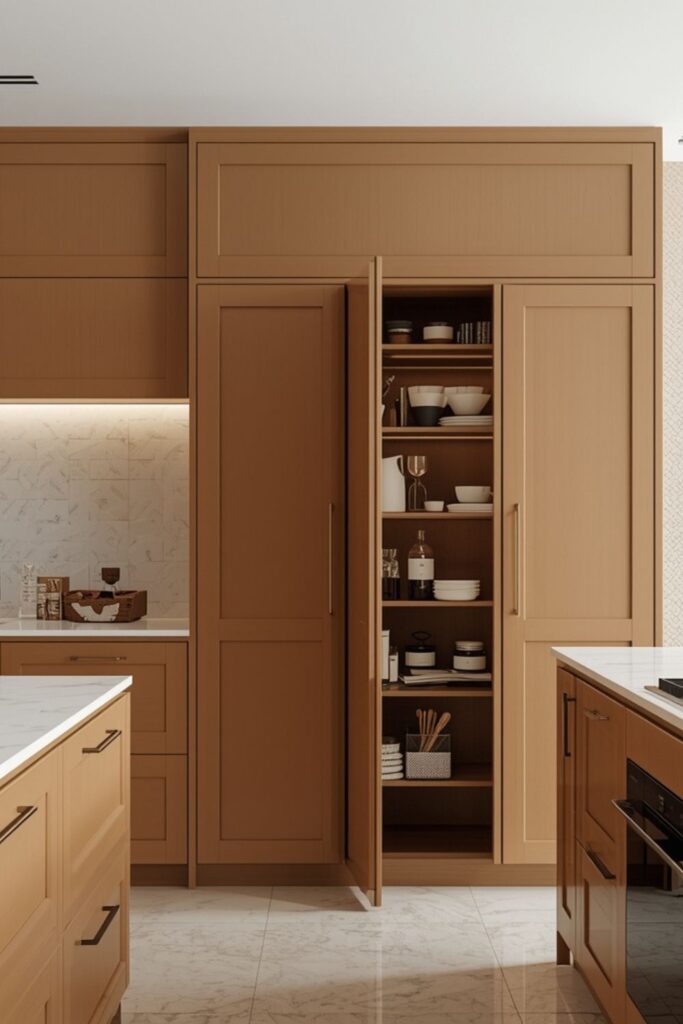 By using the same color, finish, and handle style, the pantry visually disappears into the kitchen wall. This keeps the space feeling cohesive and balanced. Integrated pantry cabinets are ideal for homeowners who prefer a minimalist look without sacrificing storage.