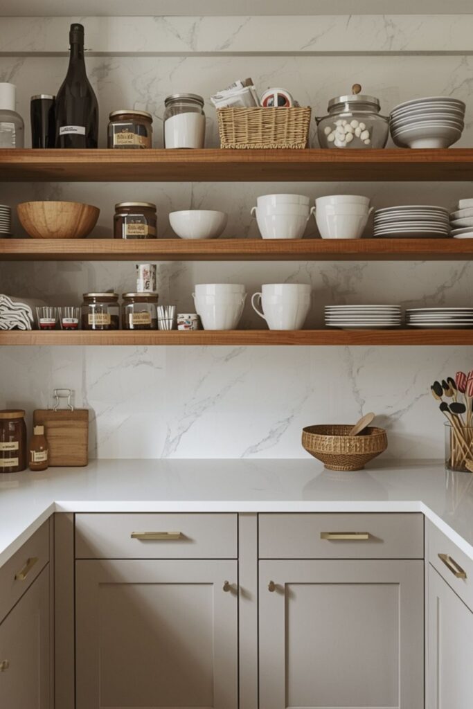 Open pantry shelving is used selectively in modern kitchens to support accessibility and visual lightness. Instead of hiding everything, open shelves display neatly arranged essentials such as jars, bowls, or baskets.