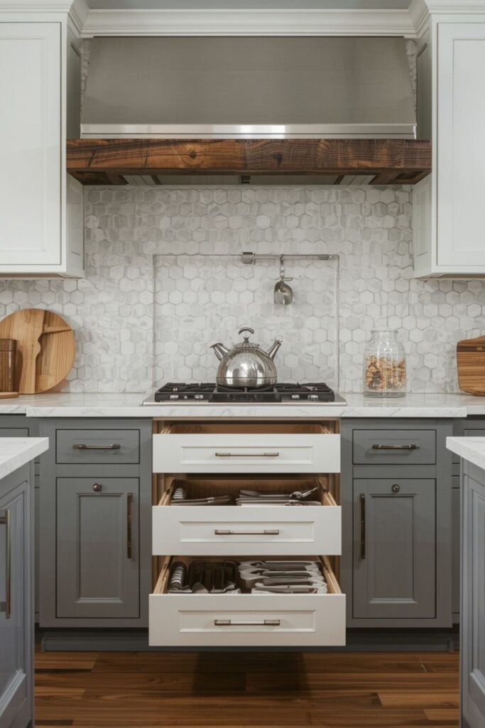 Storage should serve daily habits, not just appearance. Practical kitchen design tips and tricks often emphasize drawers over cabinets because they offer better visibility and access. Deep drawers, pull-out shelves, and corner units help keep items organized and easy to find.