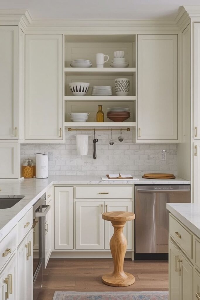Extending cabinets closer to the ceiling or adding slim open shelving can dramatically increase storage without increasing footprint. Vertical storage also draws the eye upward, which visually stretches the room and makes the kitchen feel taller and less cramped.