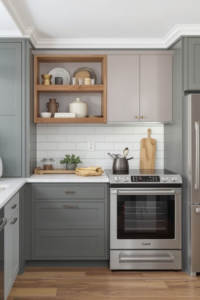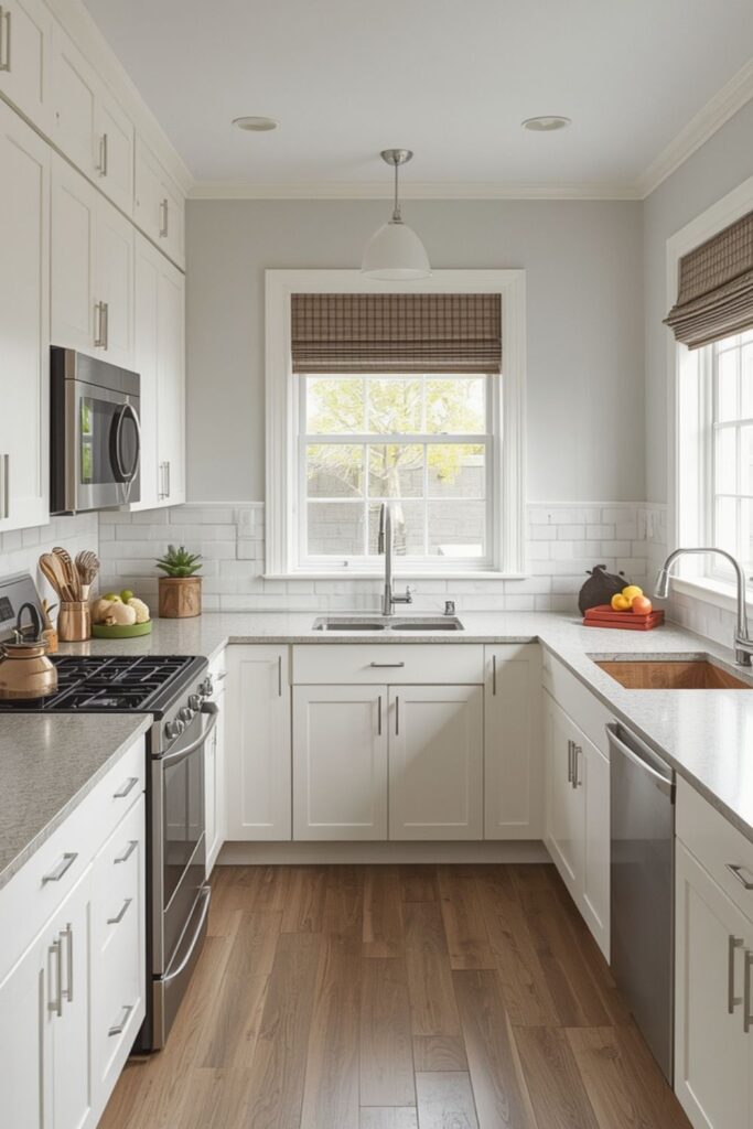 Color choice plays a major role in how small kitchens feel. Light colors reflect natural and artificial light, making spaces feel larger and calmer. Soft whites, pale greys, and warm neutrals are common in Small Kitchen Layout Solutions Ideas.