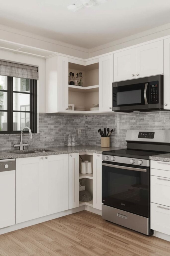 Among Small Kitchen Layout Solutions Ideas, the L-shape is popular because it balances storage and openness. It allows corner cabinets, which can be fitted with smart pull-out solutions. This layout works well in small modular kitchen design plans and modern apartments.