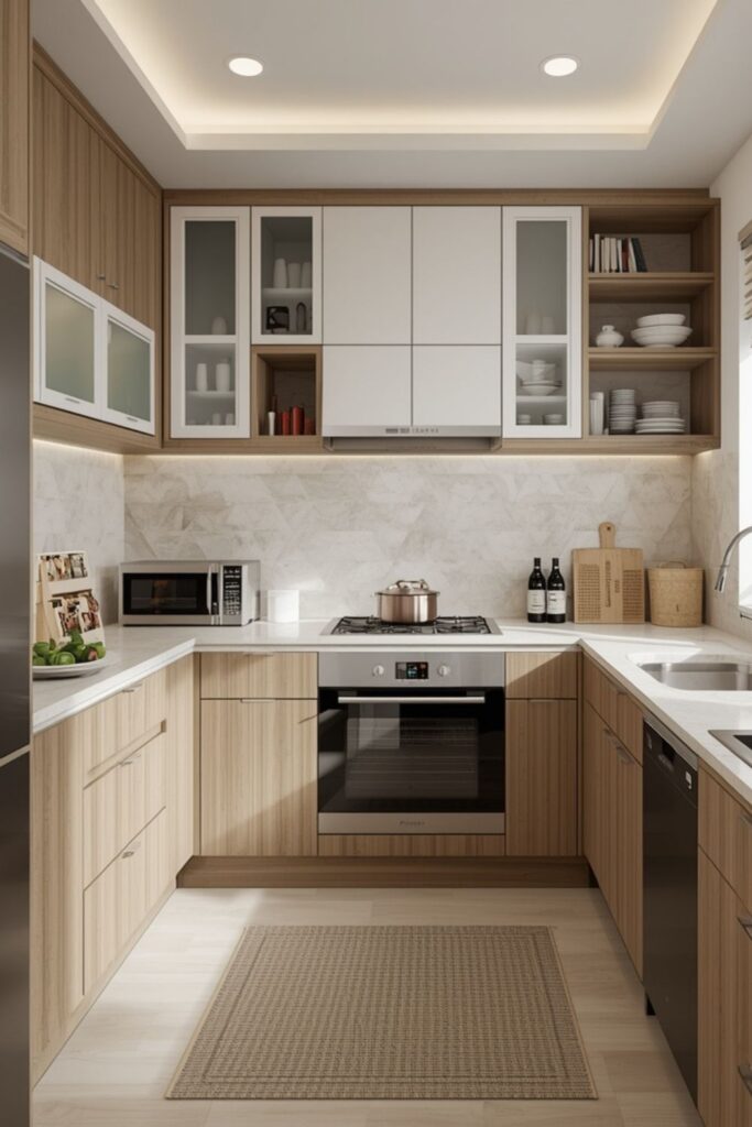 In small kitchens, keeping the U-shape open on one side helps prevent a boxed-in feeling. This layout works well for homeowners who cook frequently and need everything within easy reach. Smart cabinet planning makes this layout highly efficient.
