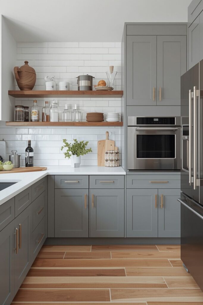 Vertical storage is essential in Small Kitchen Layout Solutions Ideas. Tall cabinets, wall-mounted shelves, and overhead storage help keep the floor area clear. Using height instead of width allows small kitchens to remain open and functional.
