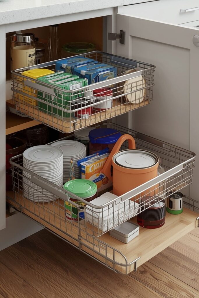 Corners often waste space. Modern solutions like rotating baskets or pull-out corner drawers allow these areas to be accessed fully.