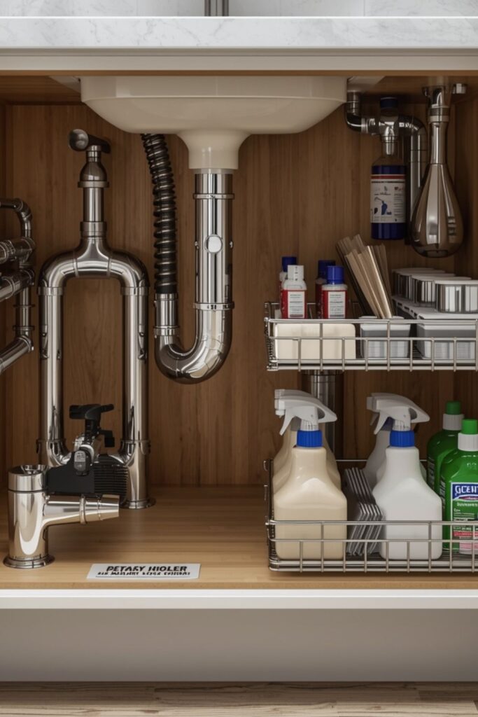 The area below the sink is often poorly used due to plumbing. Smart storage systems designed for this zone include U-shaped drawers and pull-out bins that work around pipes.